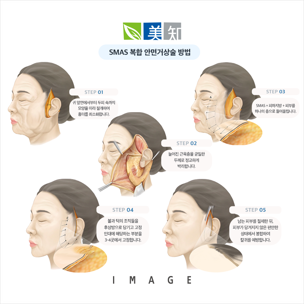 이미지성형외과에서는 피부와 피하지방, SMAS층을 하나의 복합 피판으로 형성하여 동시에 끌어올리는 수술을 시행하고 있습니다.